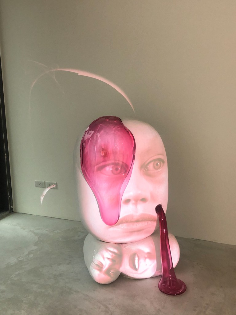 From Los Angeles, Oursler is known for his innovative integration of video, sculpture, and performance. Oursler works with diverse media technology to investigate the dissonance between moving image, object, and sound. The show features a small size sculpture from Oursler. Video of human faces are projected, in pink hue, onto the white curvy sculpture covered partially by pink transparent resin. The pink transparent resin dripped on the white cast. The rich visual experience is complimented by a female voice soundtrack. Although small in size, Oursler’s installation is one of the strongest artwork in the gallery. Under the teaching of John Baldessari, Oursler earned a BFA from California Institute of Arts in 1979. Tony Oursler has held a retrospective at the Kaohsiung Museum of Fine Arts in 2021 among many other well-known international institutions.