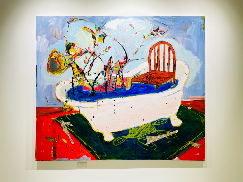 The second part of the pop-up programme “Medium is Memory” presents 6 contemporary artists: Do Ho Suh, Angel Otero, McArthur Binion, Lee Bul, Shirazeh Houshiary and Mandy El-Sayegh. The main gallery features a yellow fabric refrigerator, an expressive painting of a filled bathtub, and a bold green and blue painting on handwritten notes. I think the message here is clear, the show is going to be focused on a tactile household experience that may speak to many.